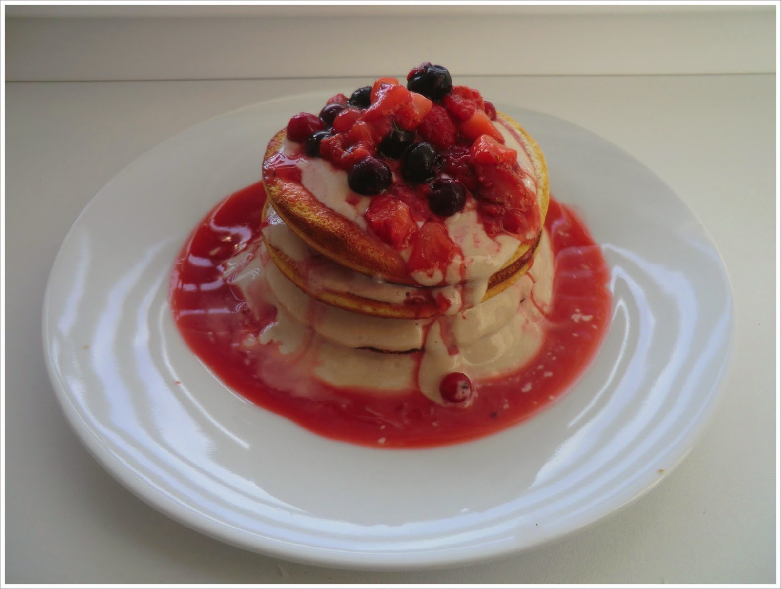 Pod tou hromadou ovoce se skrývají lívance :D Polité bílý jogurtem a datlovým sirupem.